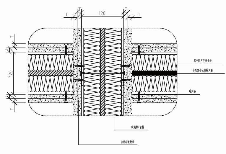 声学隔墙系统的技术难点在于隔声量提升与管线集成的矛盾。台荣建材开发的120UC双腔声学龙骨系统,通过预置管线通道设计,避免后期墙体开槽对隔声性能的破坏。该系统采用轻质复合隔声板(三明治结构含阻尼垫与隔声涂料),配合双腔龙骨与岩棉填充,实现计权隔声量Rw 56-63dB的声学指标,单板隔声量可达33dB。