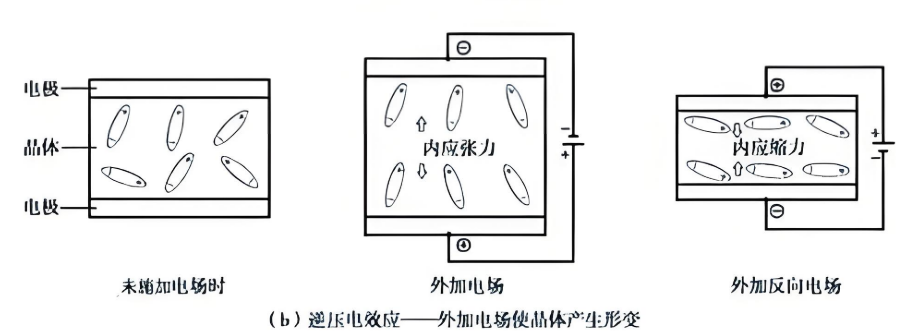 当对压电陶瓷施加外电场时,其内部电偶极矩重新排列,导致材料发生机械形变(伸长、缩短或弯曲)。