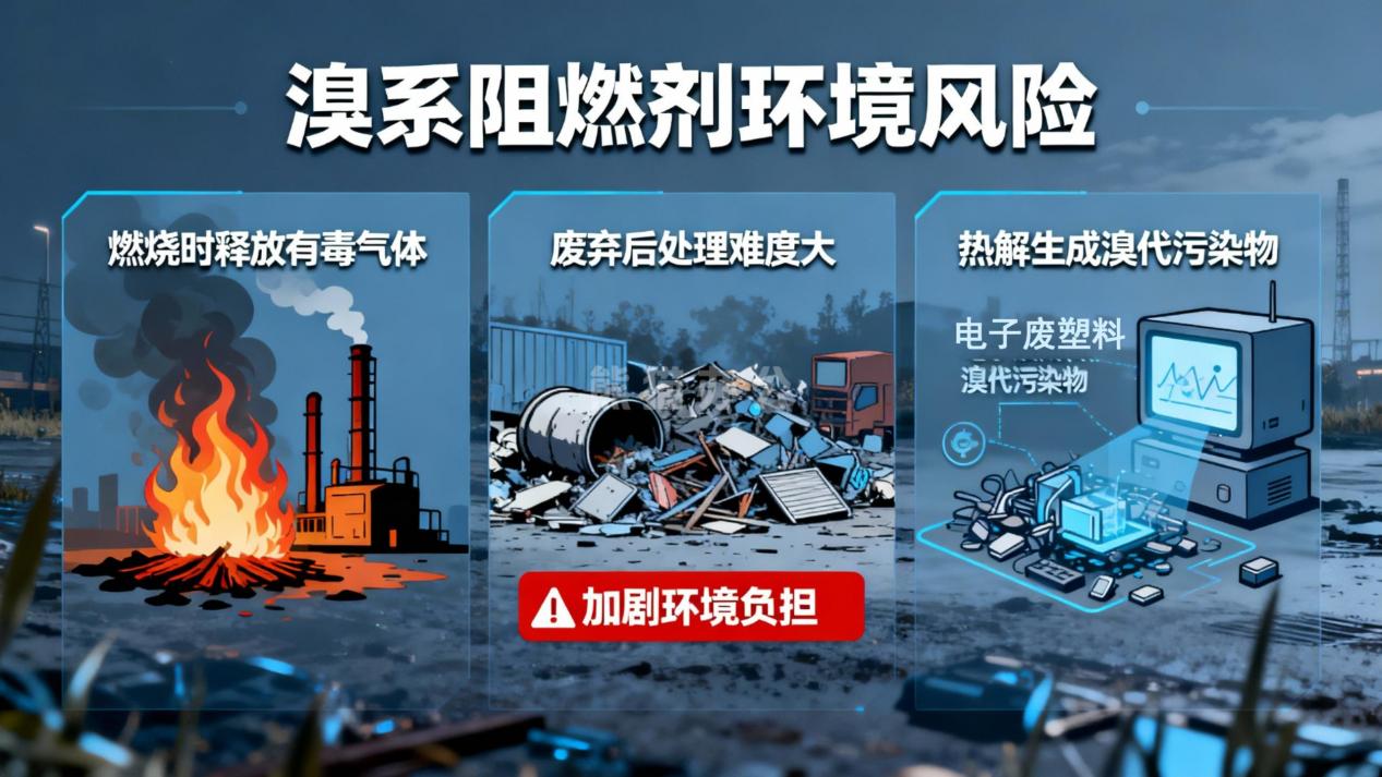 溴系阻燃剂曾因高效性广受青睐,但研究显示,其在环境中持久存在且易生物累积。例如,新型溴代阻燃剂(NBFRs)如DBDPE,已在全球空气、水体及生物体(如海豚)内广泛检出,并通过废水污泥进入生态系统,对健康构成潜在风险。此外,溴系阻燃剂在燃烧时可能释放有毒气体,而废弃后处理难度大,电子废塑料热解时还会生成溴代污染物,加剧环境负担。