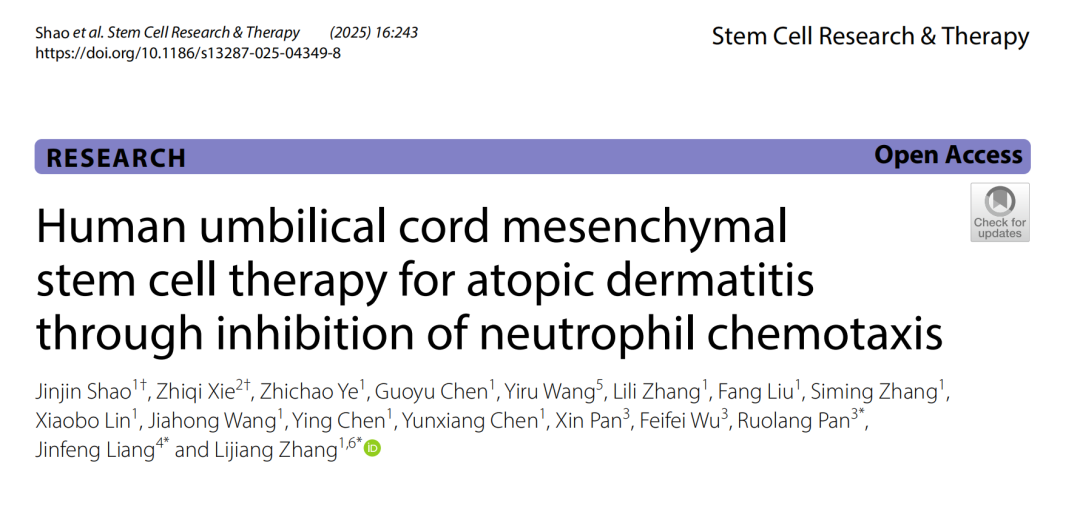 近期,来自杭州医学院的张立将教授团队在Stem Cell Research & Therapy杂志发表了题为“Human umbilical cord mesenchymal stem cell therapy for atopic dermatitis through inhibition of neutrophil chemotaxis”的科研论文,IF=7.3。
