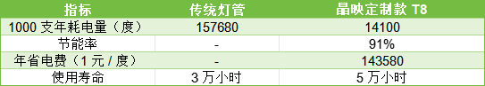定制化的调节逻辑,带来的是实打实的节能效果。我们以1000支灯管的使用场景为例,对比传统灯管与晶映定制款T8的关键指标: