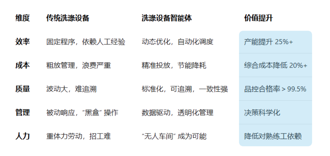 洗涤设备智能体是洗衣行业数字化转型的终极形态。它通过将数据这一新的生产要素深度融入生产流程,最终实现降本、增效、提质、减排的核心目标,推动整个行业从“劳动密集型”向“技术密集型”跨越。