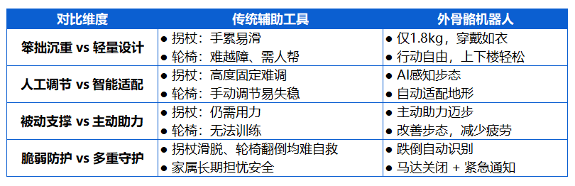 在日常使用中,传统辅助工具如拐杖和轮椅暴露出诸多缺陷:笨重难行、调节繁琐、依赖人力、缺乏主动保护,不只加重身体负担,更限制了使用者的行动自由与生活信心。长期依赖这些设备,反而可能因缺乏主动参与而加剧功能退化,家人也因出行安全风险而忧心忡忡。